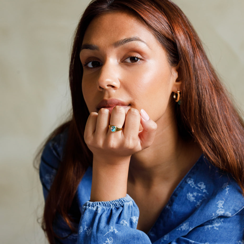 For a meaningful December birthstone gift, a petite turquoise sits in a bezel setting on a micro belcher chain ring of perfectly round links in 14k gold fill.