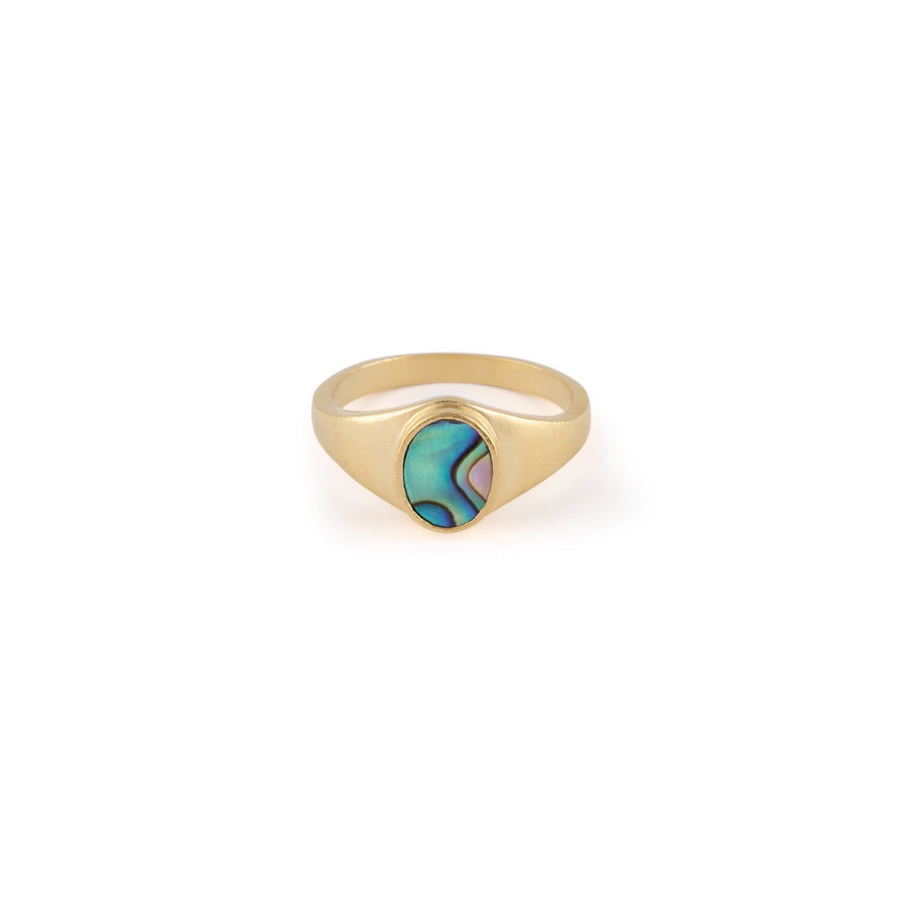 This statement ring features a luminous oval of Mother of Pearl, cradled at the centre of a thick gold band